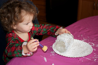 The other day we made snow candles! This is the easiest craft to do with kids and it didn't take long, which is great for short attention spans. Dylan did his all by himself, Hens still required some guidance, but not much.